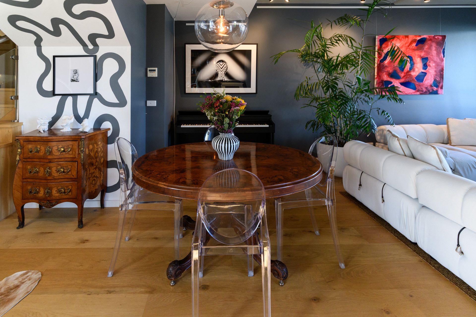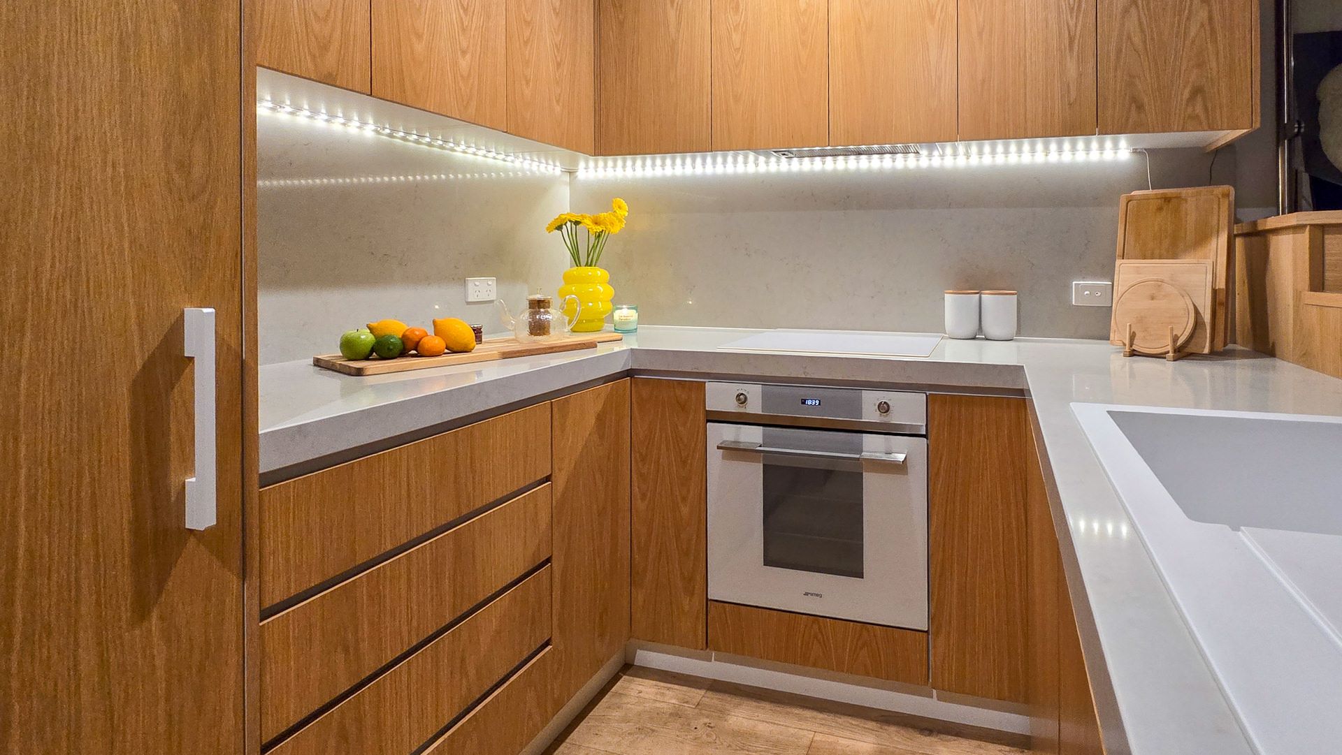 The chef's kitchen is a statement in both form and function, featuring expansive preparation surfaces, abundant storage, SMEG linear appliances, and an integrated fridge and dishwasher-equally suited to sophisticated entertaining or intimate evenings at home.