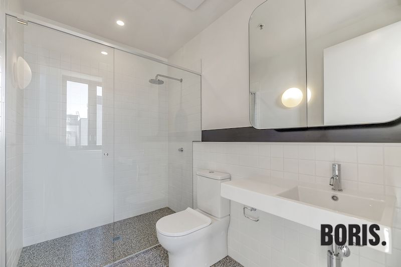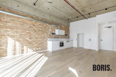 This north facing warehouse style apartment is sun drenched and offers a lot of space for a two bedroom home. Impressive timber floor, soaring high concrete soffit ceilings, full height double glazed windows and large kitchen with exposed brick feature wall.